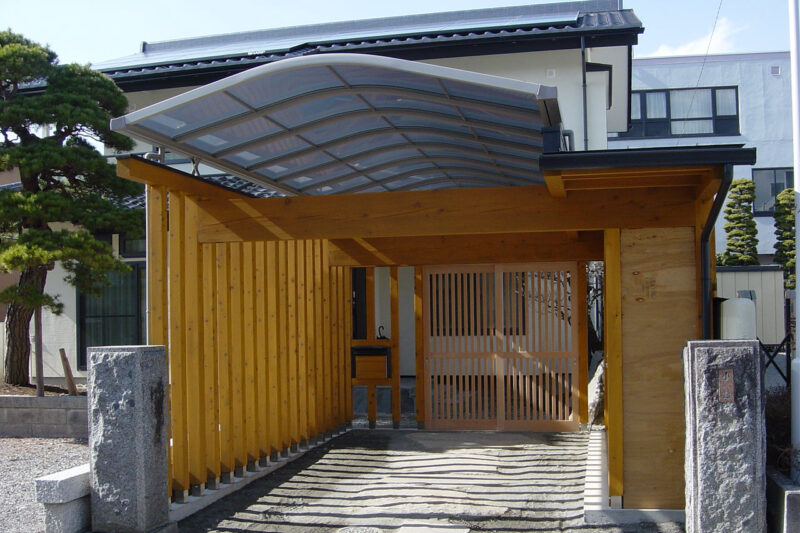 玄関アプローチは、木材を格子状に組み上げ、和の趣を演出。
